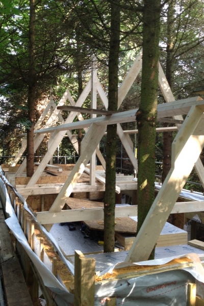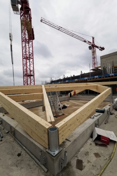 - Completion of a triangulated penthouse roof structure in Kensington for Cowley Timber, comprising of pre-formed, pre-finished panels lifted into position via a mini crane and secured and finished by our team.
